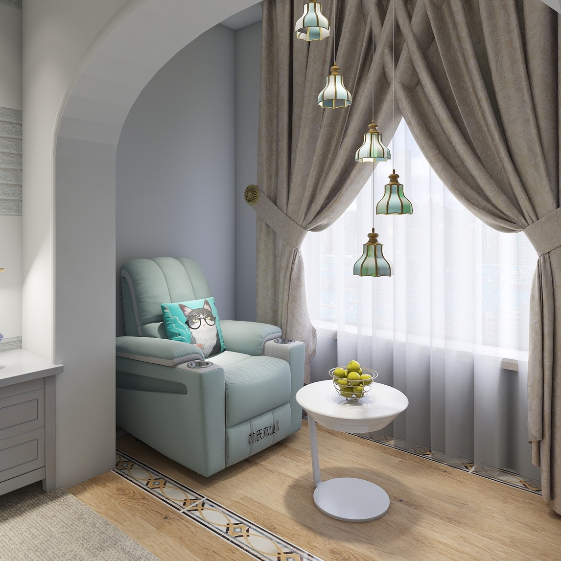 好看的螺旋吊灯,让这个小阳台好看到爆炸,搭配上青色有活力的布艺沙发和好看别致的小茶几,让这个小阳台不简单