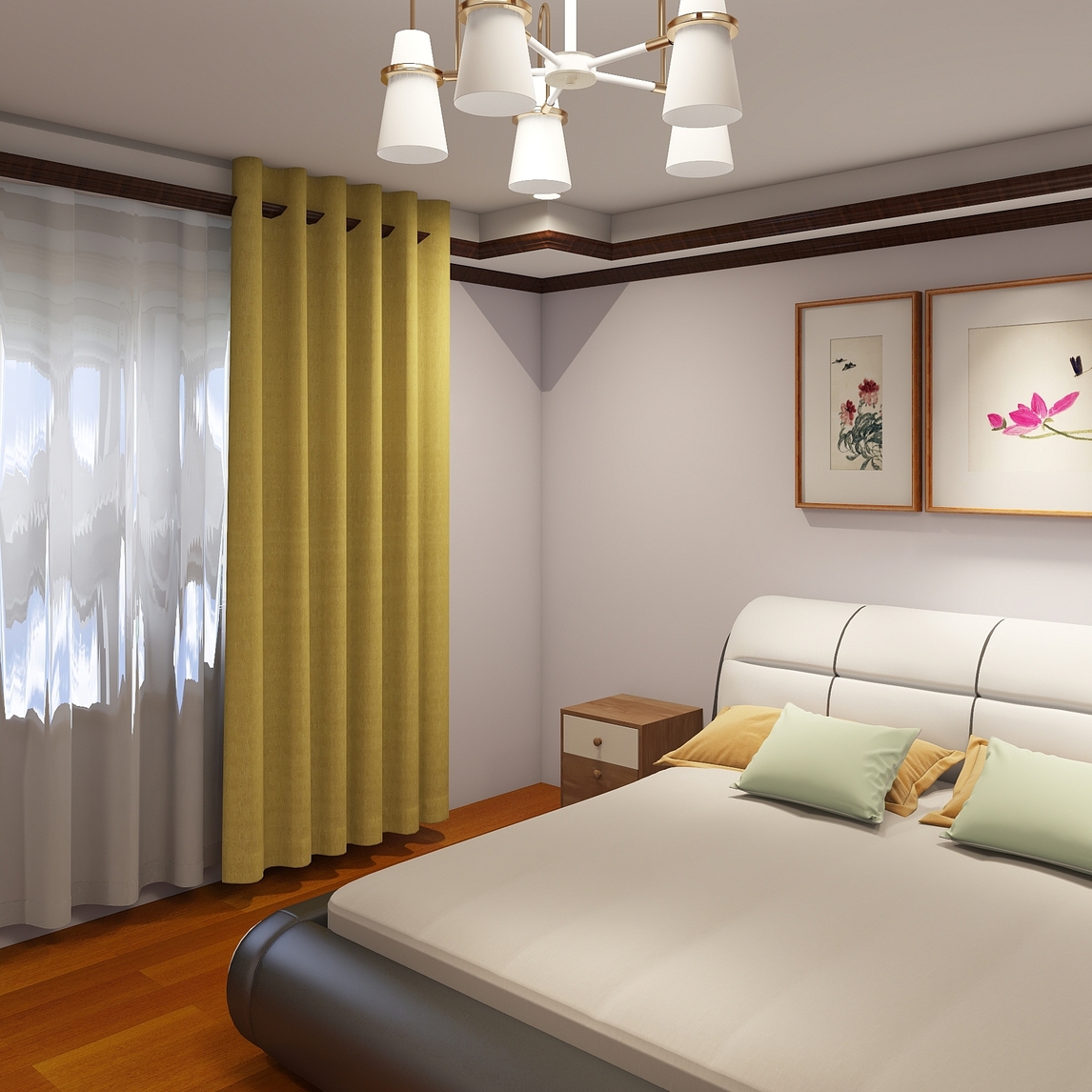 是时候有个美美的家,美美的睡眠;地板采用实木材质,无甲醛困扰;乳胶床垫的舒适,用过才知道;一副中国山水人物套画,意境清晰;墙面采用无胶水配方的乳胶漆,安心放心!