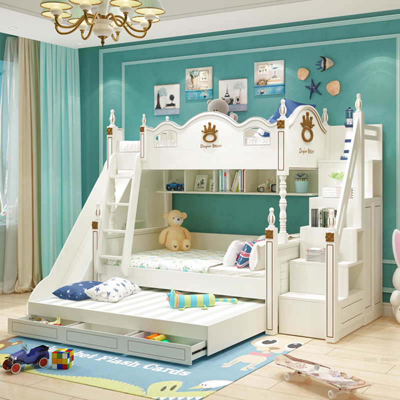 清新明亮的皇冠儿童床,旁边还带有一个小滑梯,随时变身游乐园,为宝贝提供优质舒适的成长空间。带拖床的设计,以及床自带的各种置物格,为孩子收纳各种玩具、书籍。