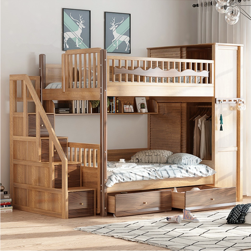 很多家庭有了二宝,都开始担心儿童房的空间问题,其实只要一个衣柜式的上下床就能搞定了,将空间利用到极致。实木上下床,不仅含有衣柜,爬梯部分也可以储物,还带有抽屉柜,加高式的护栏,又安全又美观。