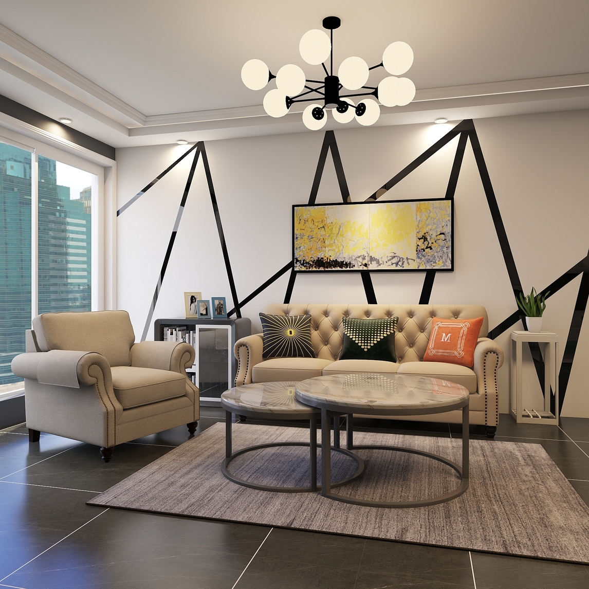 在现如今的生活中,空间里有多种风格存在已是常事,只要将其主次搭配就能呈现不一样的艺术效果。混搭的客厅中在墙面用了黑色线条来进行勾勒,加入抽象装饰画的点缀,又让其带有个性现代感,搭配上简约美式的沙发点缀...展开