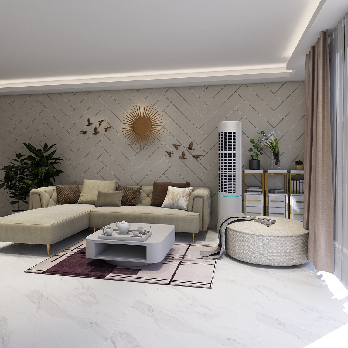 干净明快的起居室,白色大理石瓷砖和菱形的墙砖配上浅色北欧风布艺沙发,使得整个空间大气高雅。家具和地毯上深色的点缀,使素雅的格调更增加了品味。