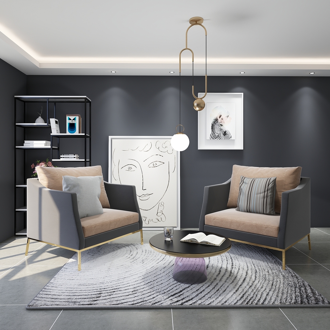 房间以灰色为主,不同程度的灰色相遇,让空间显得更具时尚感,同时也体现出空间的优雅质感。深灰色的墙面搭配浅灰色哑光地砖,然后用灰粉色休闲沙发搭配个性地毯,打造出时尚而舒适的休闲空间,一旁还有铁艺书架和抽...展开