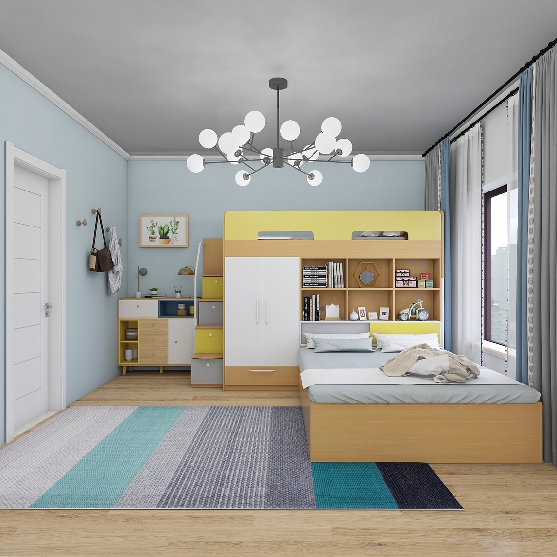 实用省空间的高低儿童床,用一个床的空间满足睡眠储物学习等多种需求,再搭配其它的趣味北欧家具,让小户型不再为空间所束缚。