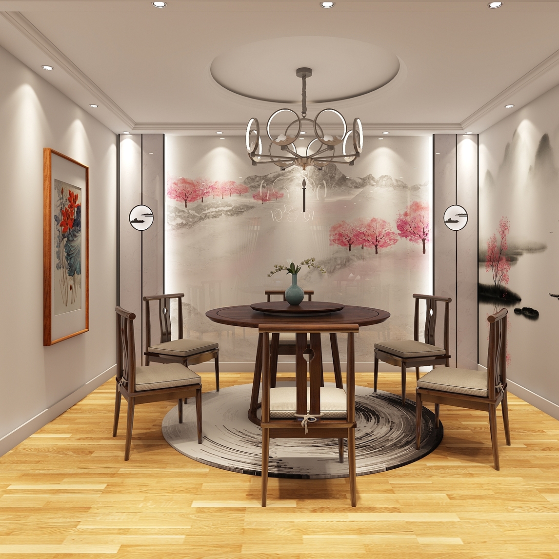 新中式风格有着优雅含蓄的东方美感,在加入现代元素的设计,又能让其感受到别样时尚韵味。餐厅的墙面有着一大幅水墨山水图的设计,尽显清新秀美韵味,而加入简约木质餐桌椅的陪衬有为其增添了几分古朴韵味,搭配上中...展开