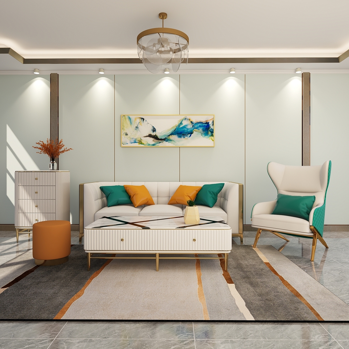 餐厅以白色调的艺术背景墙搭配灰色大理石地砖,打造出简约时尚的质感空间。然后选用白色皮艺沙发加白色烤漆茶几作为搭配,沙发上还带有孔雀绿元素,加上绿色和橘黄色的抱枕作为点缀,更能显出优雅的时髦气息。与极具...展开