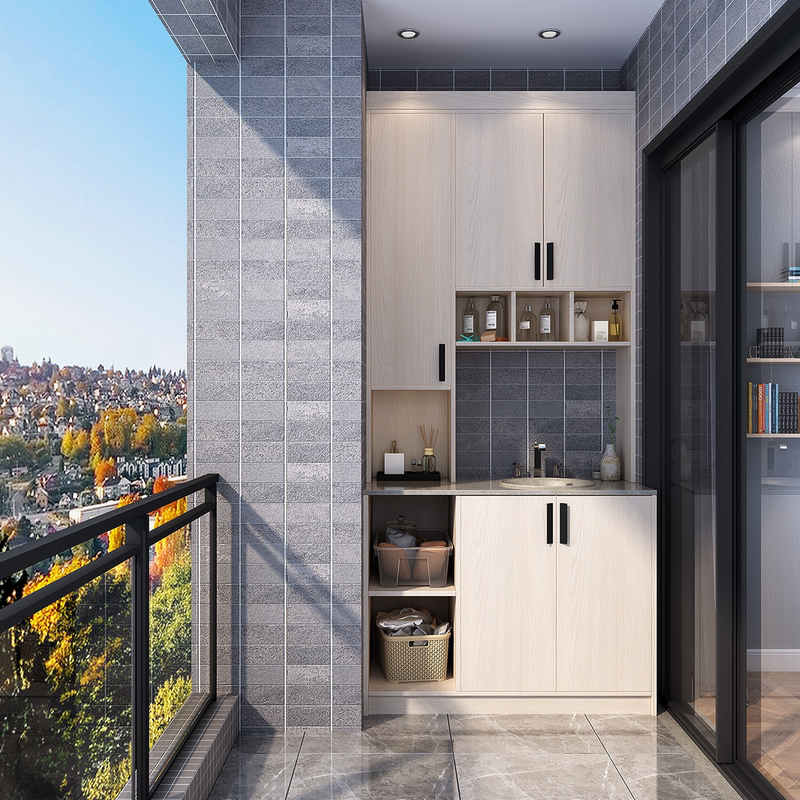 阳台除了收纳空间外,可以做功能的延伸。洗手盆+储物柜的设计,让阳台多一处水源区,清洗更便捷;半开放式设计,保证收纳空间的同时也可以让阳台成为小小的家政区使用,物品置取方便,空间更富有变化。