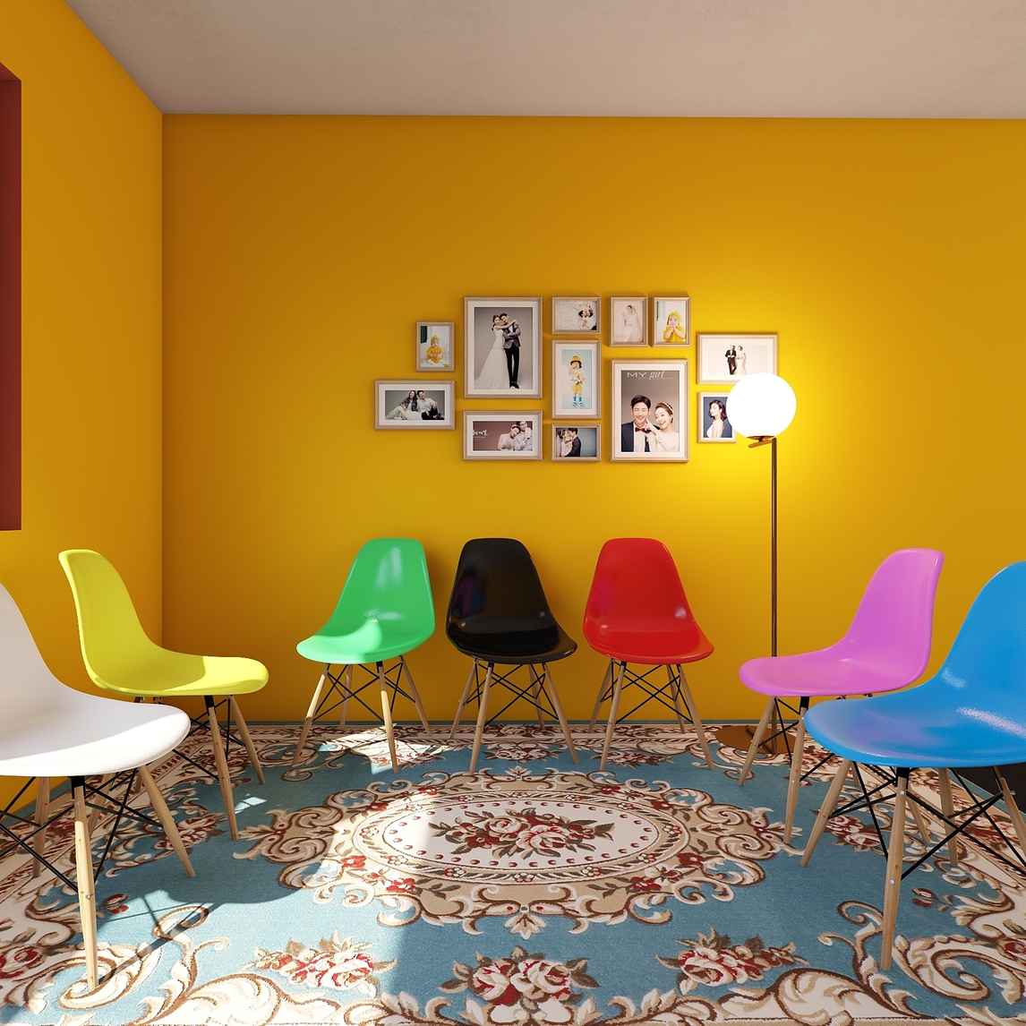 非常明艳的黄色墙面,五颜六色的椅子,人们可以聚在一起喝喝茶,聊聊天,整个氛围会看起来非常的美好又和谐。