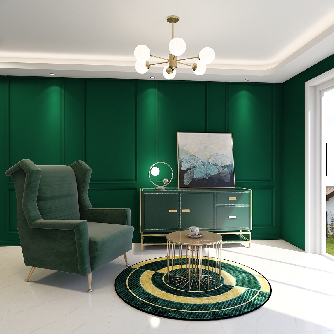 浓郁优雅的绿色墙面营造出时尚的复古气息,用白色地砖相搭,平衡一下浓重的色彩,打造出更加和谐舒适的视觉感;然后选用造型别致的布艺休闲椅搭配小圆毯和金色圆几,让优雅的绿调与时髦金色相遇,更显出精致优雅的高...展开