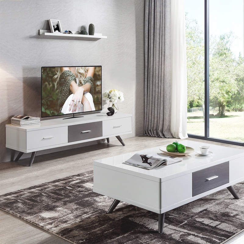 白色现代烤漆茶几组合搭配北欧风花色地毯,让客厅简单却不失单调。木质地板映衬,将整个现代风和北欧风融合的十分完美