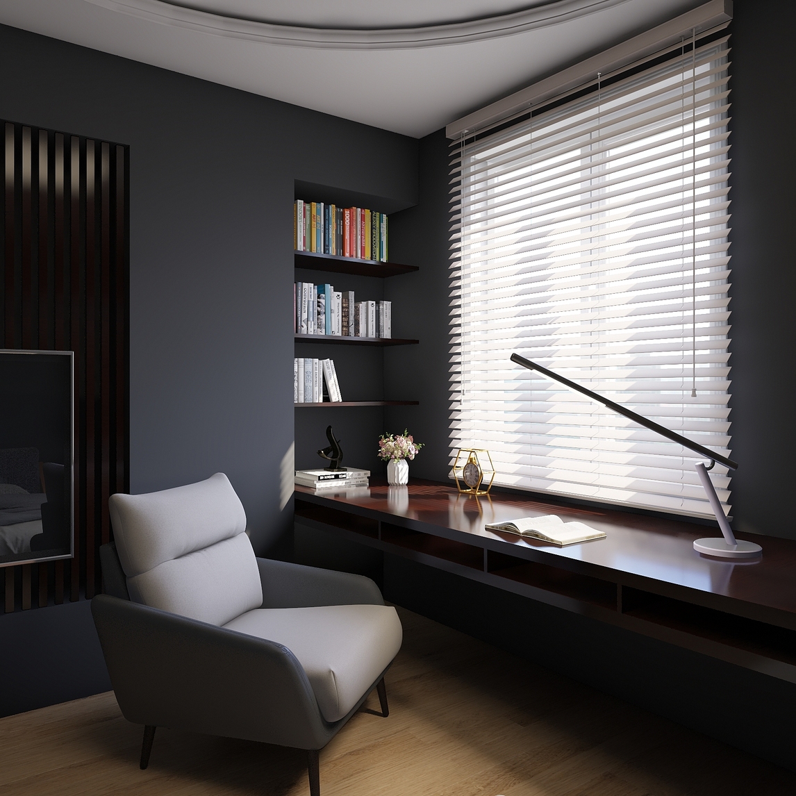 书房,阅读和工作的地方,对光线要求比较高。百叶帘使室内光线变得柔和,隔离外界噪音,搭上台灯,可以随时调节室内光源,还您一个舒适的阅读环境。