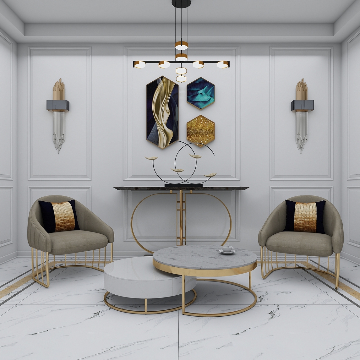 带有一丝灰色感的白色墙壁,清爽干净,再使用石膏线来打造出框架,以及富有质感的挂件装饰,让空间整体呈现出简约而又不失格调的氛围,而单人沙发只使用了布艺元素与金色线条打造,搭配上大理石纹的地板,使得休闲室...展开