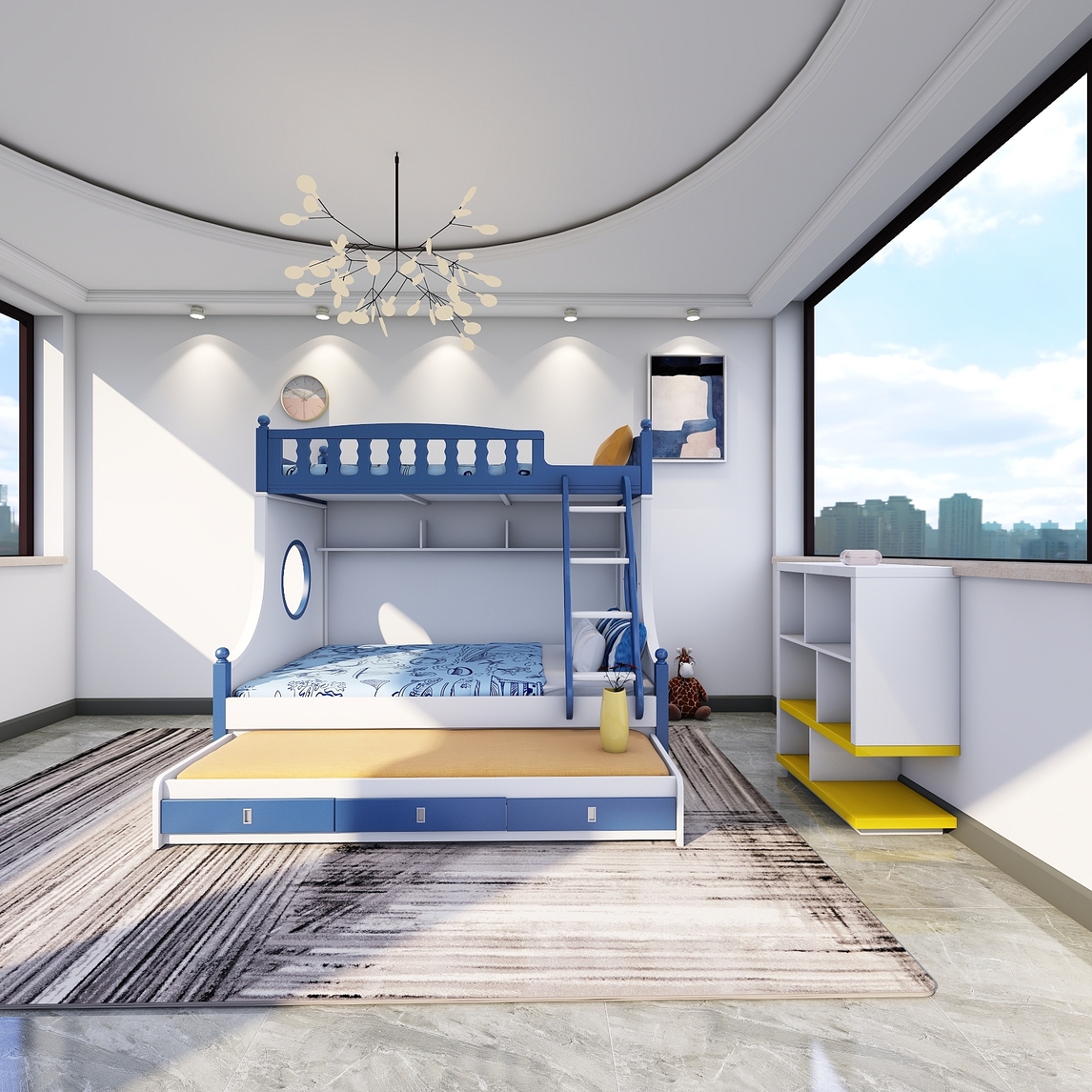 小户型儿童房双层床高低床 玩出生活多种可能,打破小户型的极限,演绎多种玩法 颠覆对小户型的认知,休息玩乐亲子均不误 从小培养宝贝们亲情,缤纷色彩更温馨