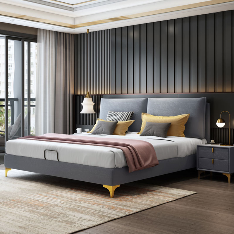 舒适感,由身及心,轻奢现代布艺双人床,优雅格调,去为你去一身疲惫,放松身心。床脚镶嵌镀金层,成色均匀有光泽,更添轻奢感。