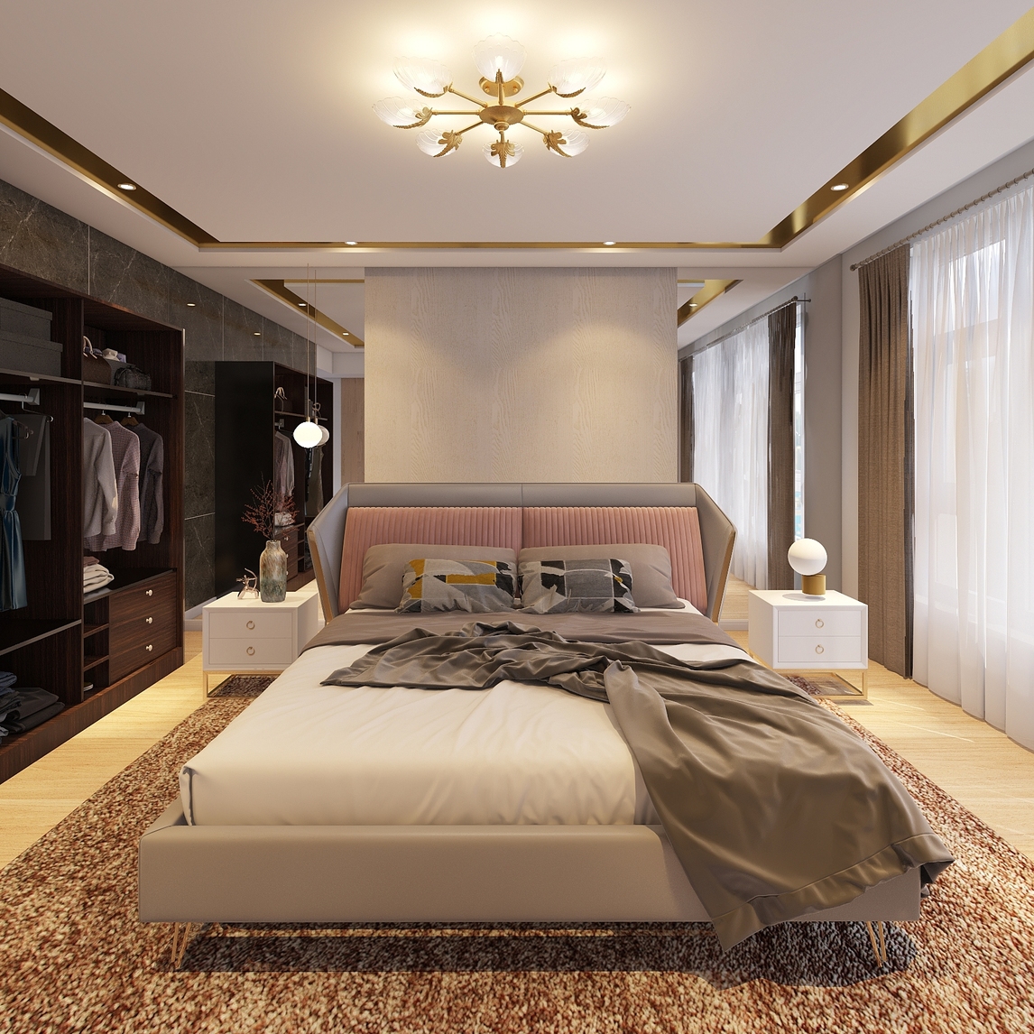 卧室以轻奢风格来进行设计,在简单的空间里融入了金色的设计,让其带有优雅大气美感。淡黄色的背景墙搭上轻奢吊灯点缀,更显时尚个性色彩,再加入一款灰色的皮艺大床,融合金色边框让其带有时尚高雅气质,搭配上抽象...展开