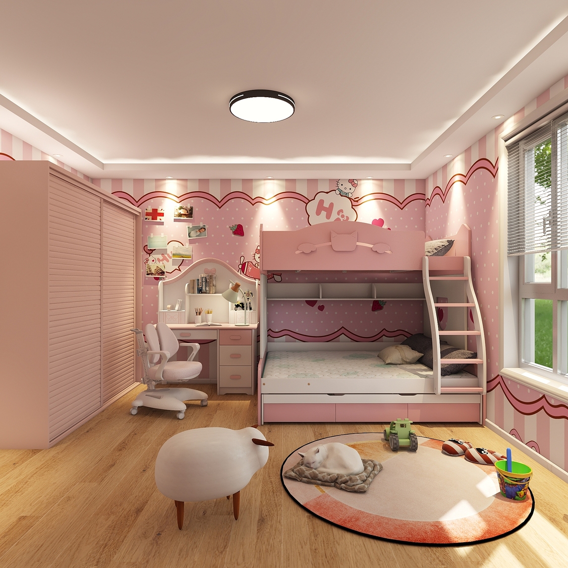 家有俩女宝,儿童房设计选择了粉嫩的色调,显得更加温馨。一边是睡眠区,选择高低床,让俩宝贝都有属于自己的睡眠空间;一边是学习区,超强大的收纳功能让房间减少凌乱;创意圆形地毯,让房间充满趣味性,两个宝宝都...展开