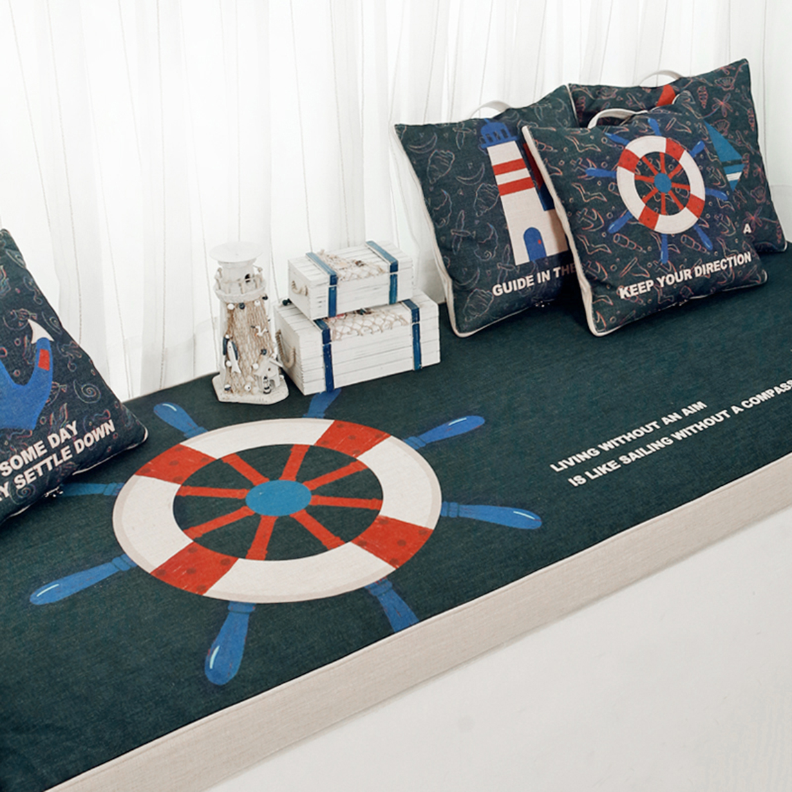 一款地中海风格飘窗垫,健康环保印染技术制作图案,以航海船舵为元素,给人一种异域舒适感,将其铺于卧室飘窗,让你轻松感受异域温馨舒适休闲氛围!
