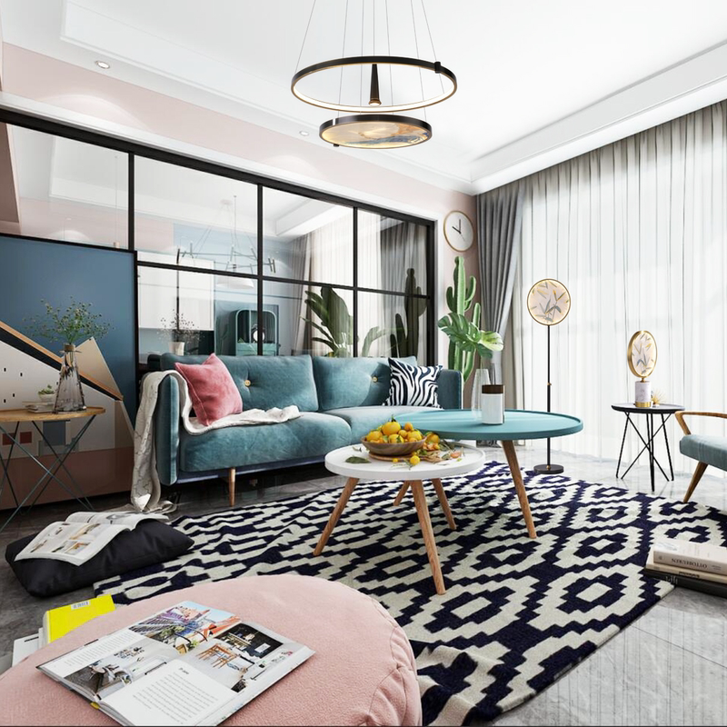 这是一对年轻夫妻自己装修的客厅,对家装风格统一没有很在意,沙发家具选的北欧风,灯饰上选的新中式,色彩上很小清新,大胆混搭。给人眼前一亮的感觉。