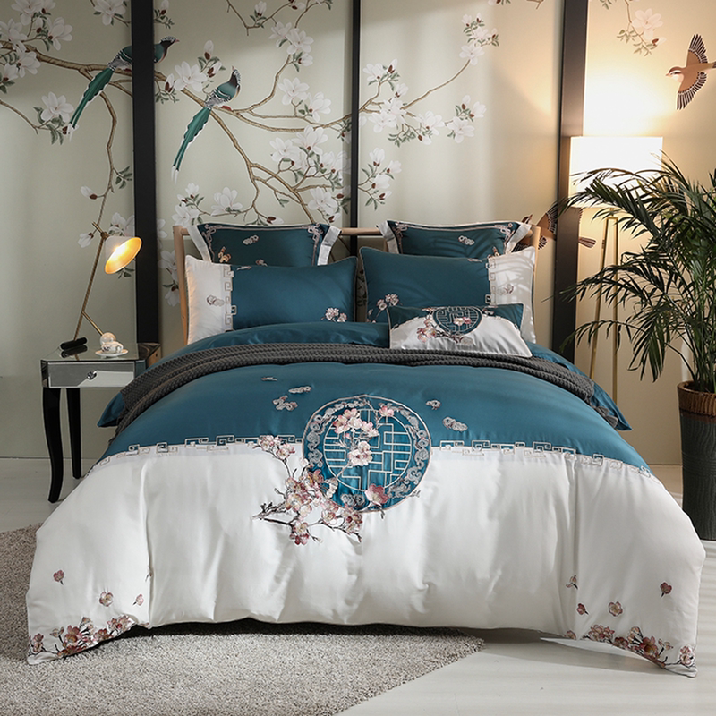 新中式中国风刺绣花纯棉四件套,采用中式的刺绣花图案设计,搭配上白绿的拼色设计,营造出典雅的中式风卧室。