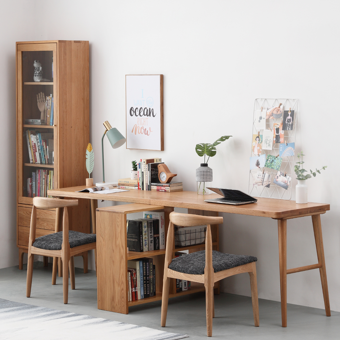 简约的北欧风书房,能够让劳累一天的你有着另一个不同的环境。一款双人书桌,两张书桌和一个书架的搭配,两人可以一起使用,简约的设计风格,搭配一款单门的书柜,更好的存放重要的文件书籍。