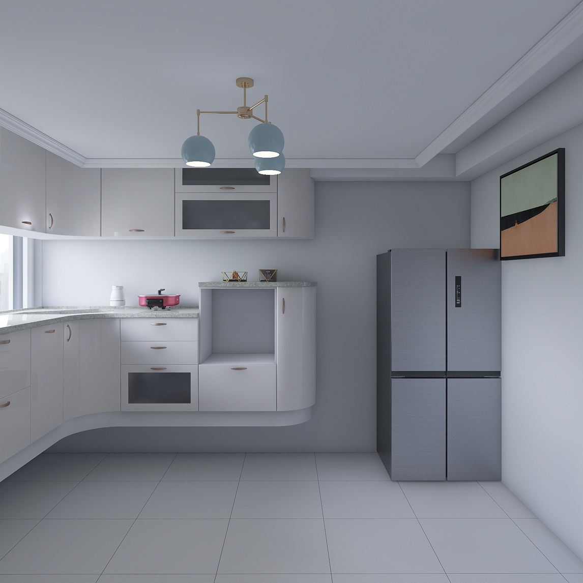 多种色调的深浅交错,区域分明,给人一种利落简洁的视觉感。欧式的顶灯设计,暖暖的照着厨房,非常的温暖温馨。就连在厨房扮演着较为普通角色的冰箱,都以星际银的配色很好的融入了整体的设计风格当中,让厨房尽显轻...展开