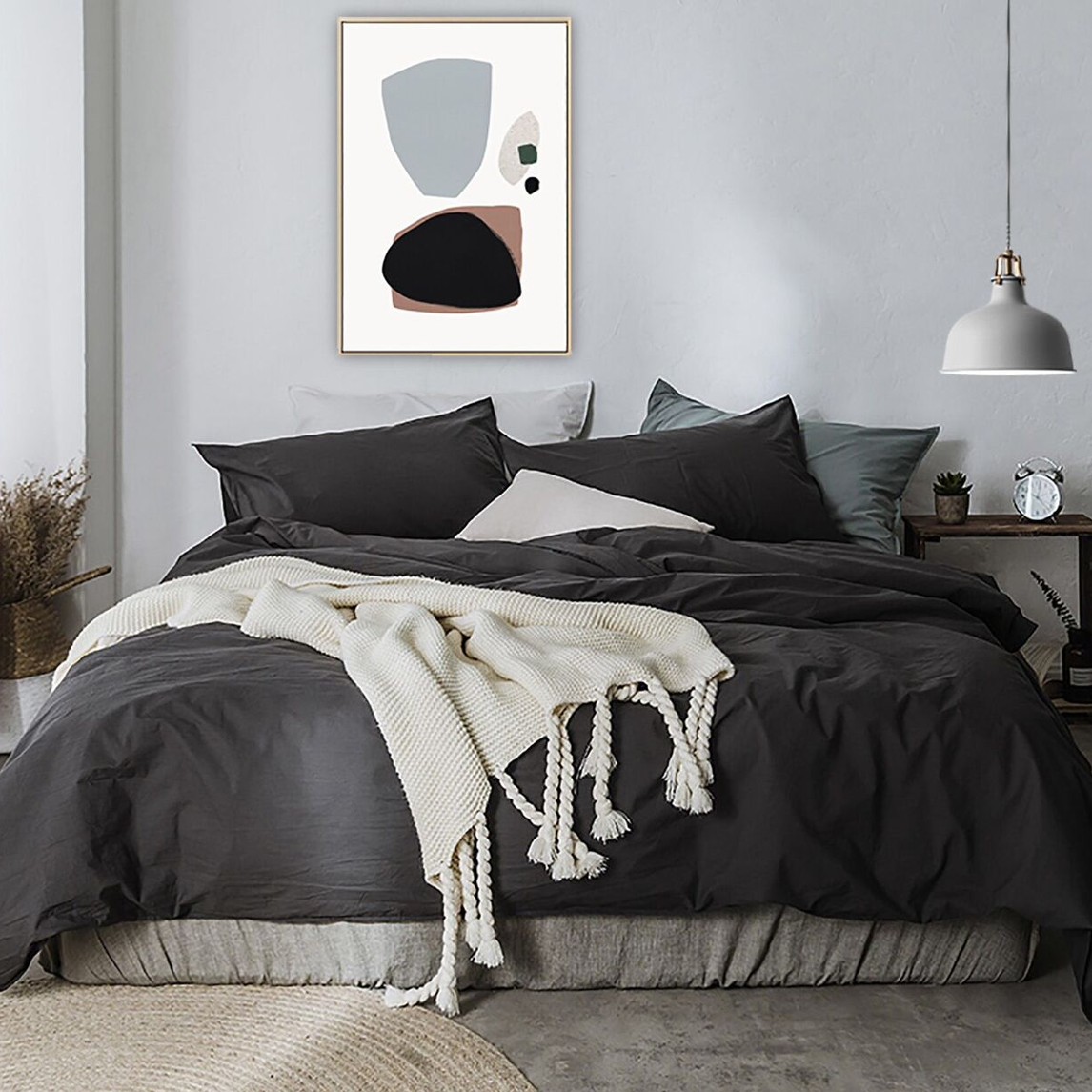 黑白灰色调可以说是很经典的一组颜色了吧!所以它也是非常耐看的。这个卧室空间选择的黑色床品很大胆有个性。墙面的装饰画也调剂了以下黑白灰色调的冷峻。