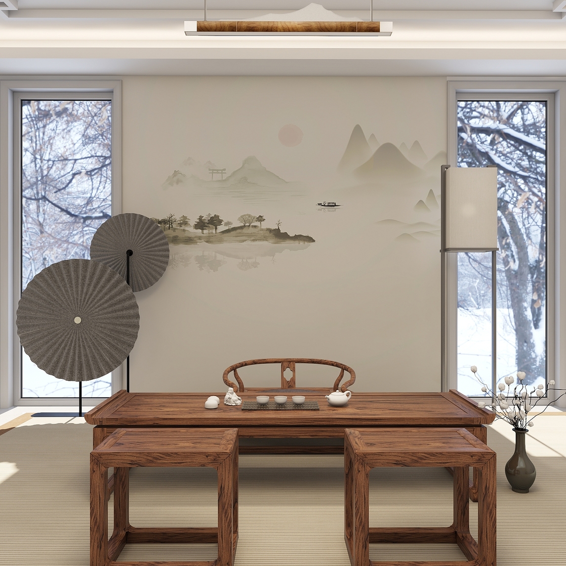 居室中有一间茶室能带来更多惬意慵懒感,以新中式风格设计的茶室选用了木材来制作家具,细腻的纹理传递出清新自然韵味,而搭配上一款素色地毯更显儒雅柔和感,其次在背景墙上还有着水墨山水画的设计,浓淡相宜的墨汁...展开