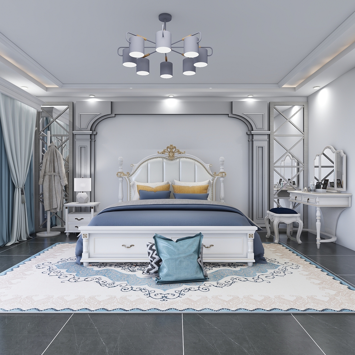 卧室中间一张白色大床,融合经典美式与现代简约元素,简单却不失优雅,床屏更是悉心设计,以金色雕花彰显轻奢格调。床头墙面借鉴了罗马柱设计,呈现出端庄厚重的美感,两侧又以镜面装饰,辅以几何线条,充满了现代感...展开