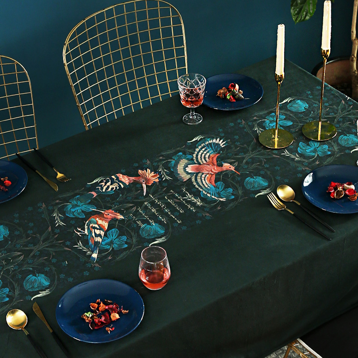墨绿色的餐厅,带着轻奢与优雅,给人更加温馨的感觉这,同时绿色与金色元素的碰撞,让它显得格外的大气,同时带着美式宫廷风格的天鹅绒桌布,几种风格元素的混搭,让这一切显得更有品质。