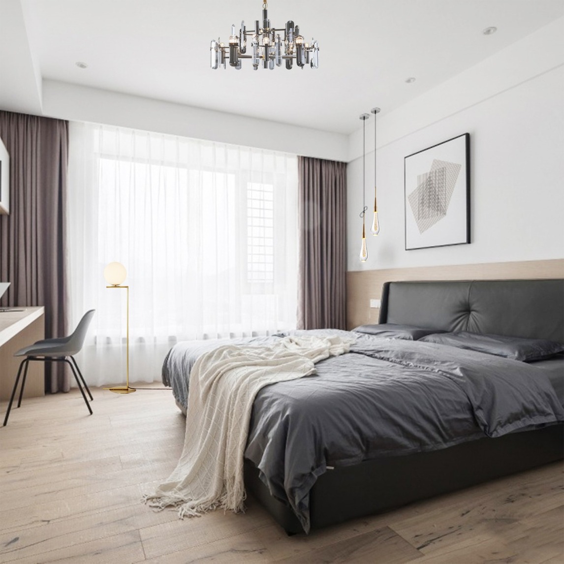 卧室配色以冷色调为主,有助睡眠,定制的寝具和床头柜搭配充满设计感的床头小吊灯,高级感充斥着每一个角落。在保持空间的完整性与感官舒畅以外,舒适是最不可或缺的需求。