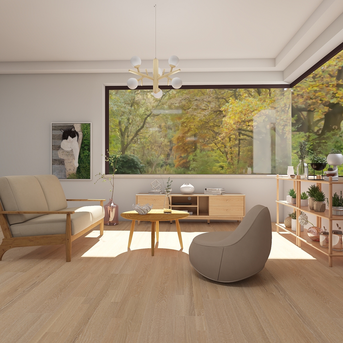 客厅采用日式MUJI风格打造而成,遵循纯粹简约的设计理念,大白墙与木地板的组合,呈现出清新素雅的色调,再搭配清一色的原木家具,营造温暖自然的生活氛围。临窗摆放开放式花架,各式绿植陈列其中,沐浴着阳光肆...展开