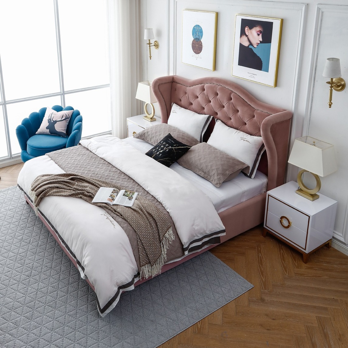 享美梦,自然醒。一张优质的床能够带给你整晚精致的睡眠。优雅的拉扣设计,让这款床看起来大气无比。季度流行的脏粉色,低饱和度更适合轻奢风格的卧室,让您舒适入眠。