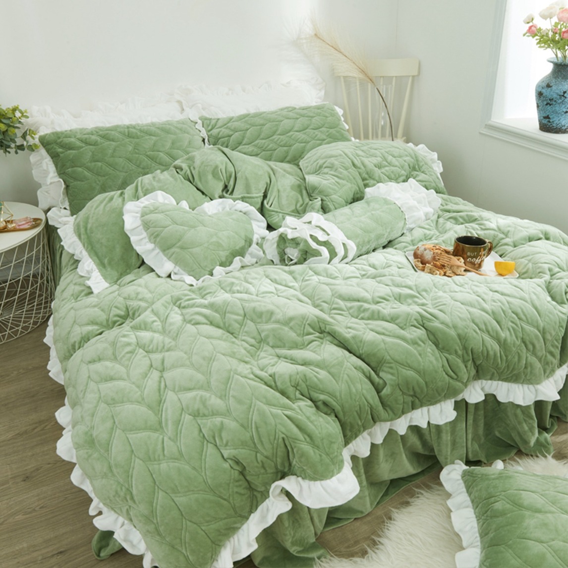 冬天加厚珊瑚绒床上四件套,草绿色调搭配上白色的木耳花边,营造出温馨的公主风卧室。采用亲肤加厚珊瑚绒面料,触感柔和舒适。