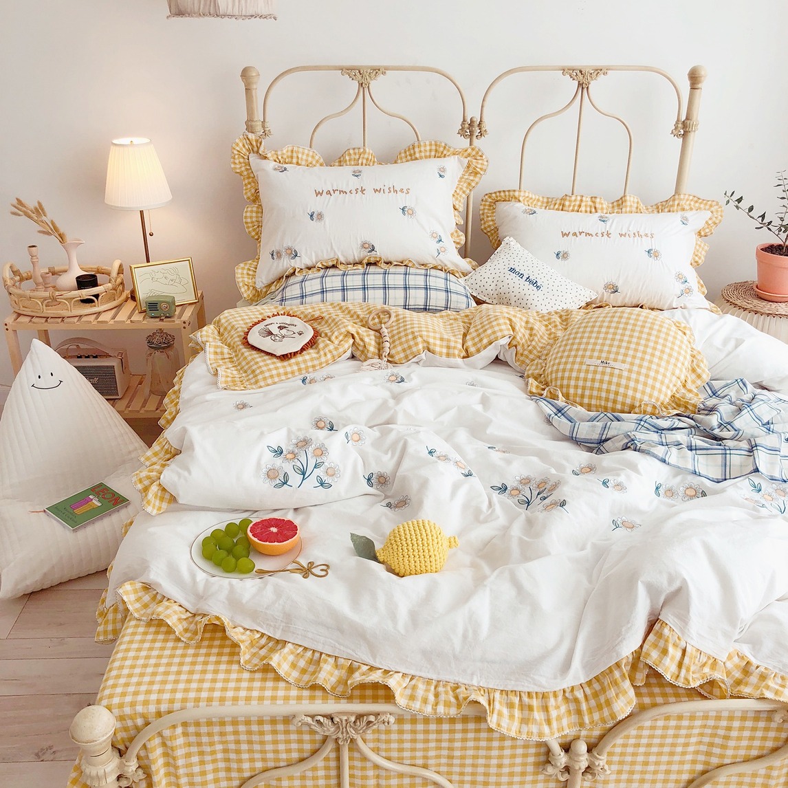 温柔的它需要你温柔的对待,黄格向日葵四件套,少女荷叶边,金线刺绣小向日葵,可爱又浪漫,分分钟征服你的少女心。