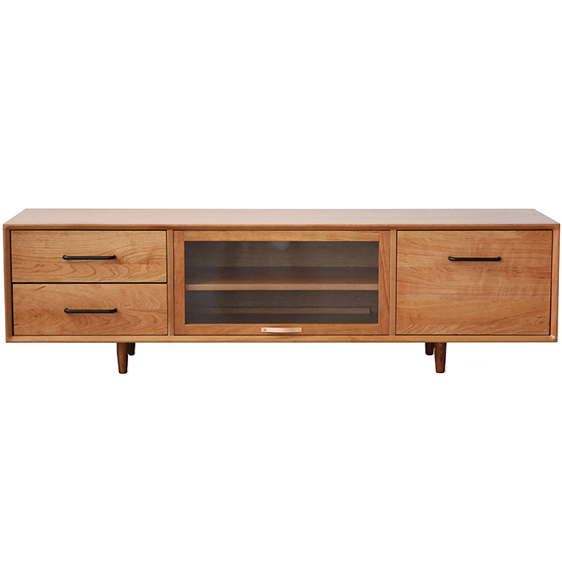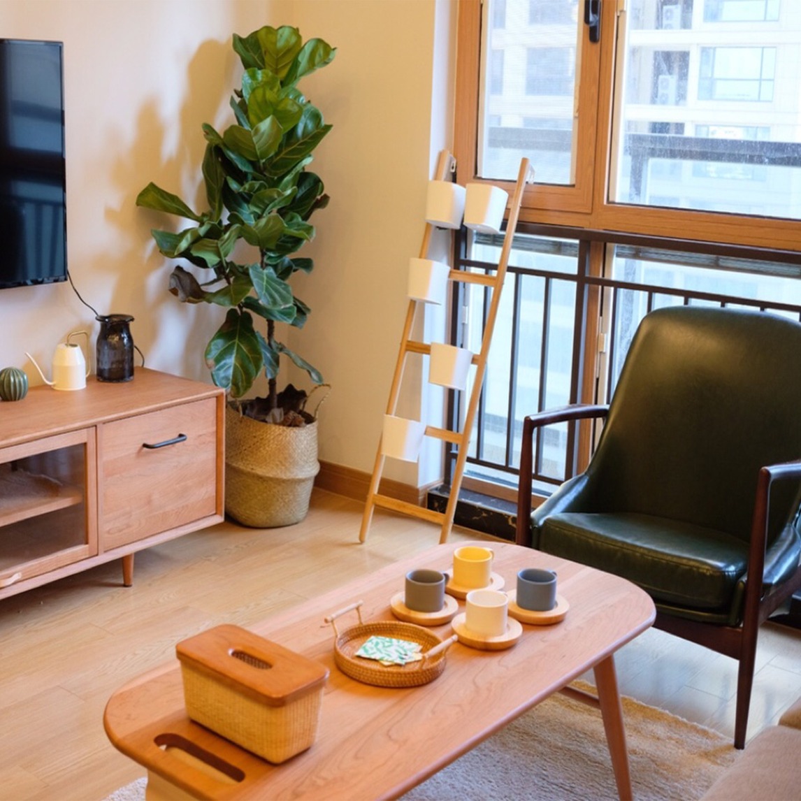 樱桃木制的实木电视柜搭配茶几相互呼应,造型简单但细节收纳十足。搭配复古风的深色墨绿沙发椅,气质瞬间提升。对于彩光不错的客厅,这样的搭配不仅柔和提亮,还很休闲。
