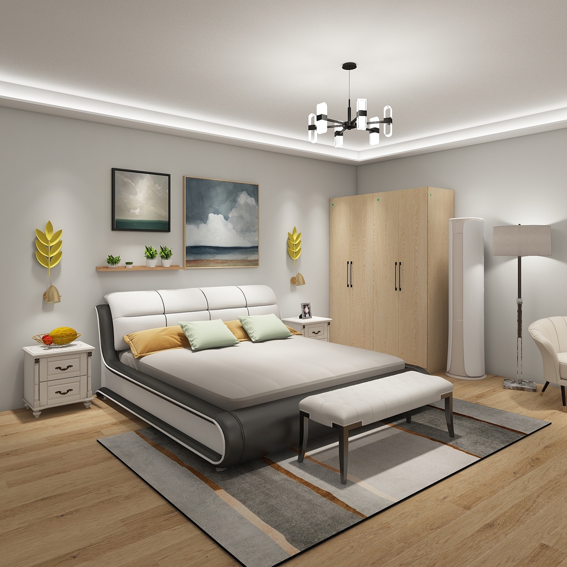 漂亮的现代装饰画装饰了整面墙,搭配上洁白柔软的皮床,给你奢侈的风格体验,加上清新的地毯和经济实用的空调,简单漂亮。