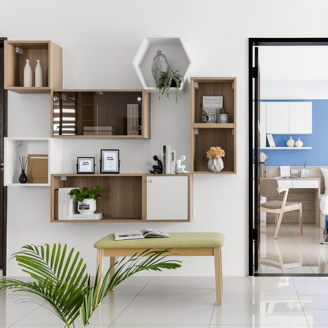 对于大户型而言,有的户型会有一面相对比较大的墙面,如果你不想用装饰画来装扮,可以考虑用装饰柜不一样的组合来装修!
