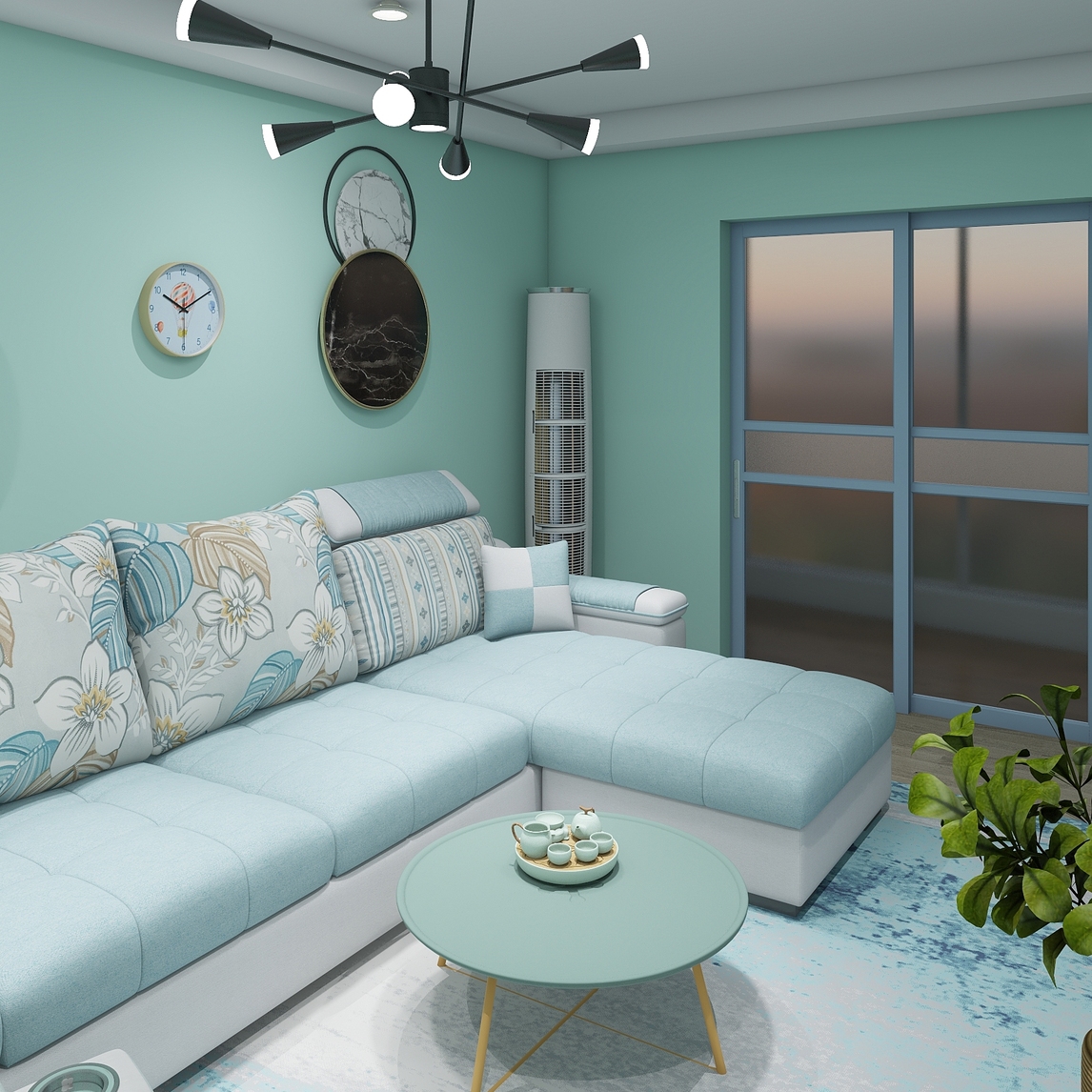 整体风格取材自地中海腹地民居装修特色,黑白色小吊灯,沙发,沙发椅,小茶几均采用海蓝色,烘托环境简约而不失奢华,实木地板非常实用,墙面采用立邦竹炭乳胶漆,净味环保,无甲醛困扰,是个会客的好地方!