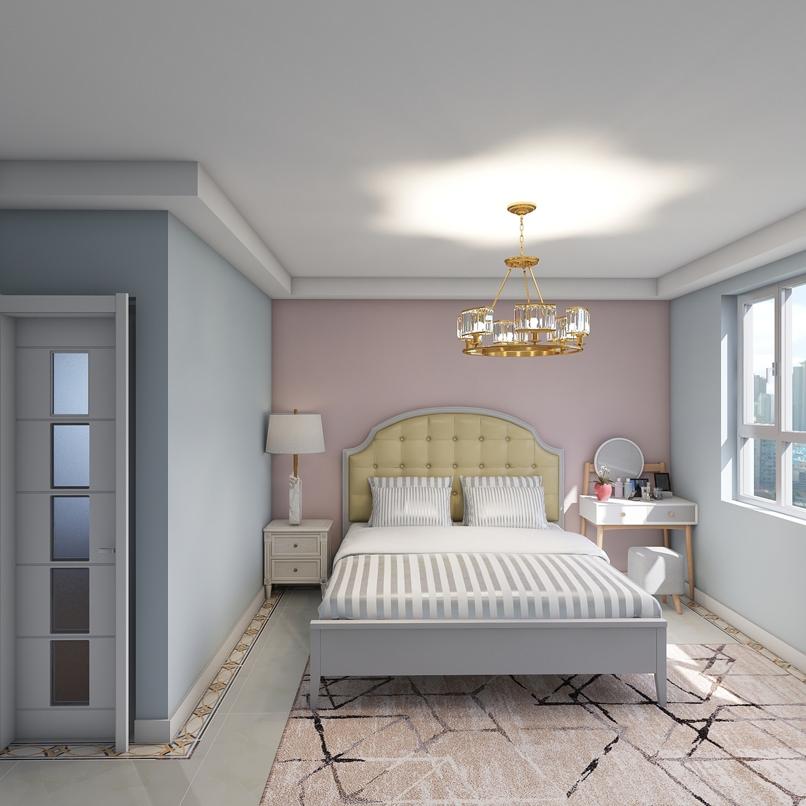 在卧室,每个人都会做最真实的自己,所以卧室也是最能反映个人性格与偏好的私密空间。卧室以粉蓝为主色调,金属吊灯、典雅床头灯等装饰凸显现代的轻奢唯美。窗户和室内门颜色与风格协调一致,打造更好的视觉美感。