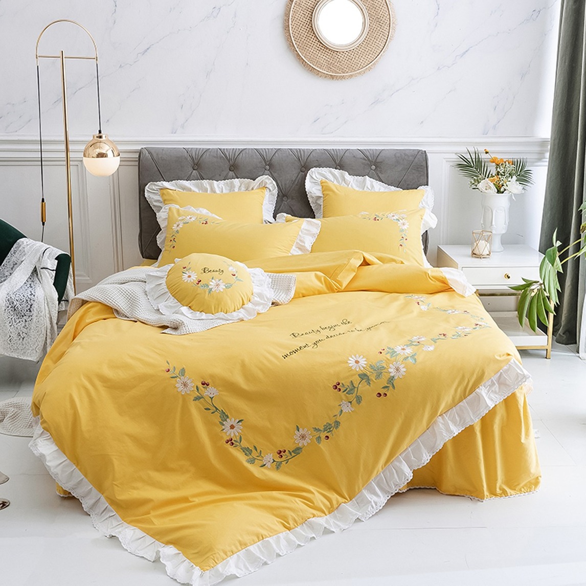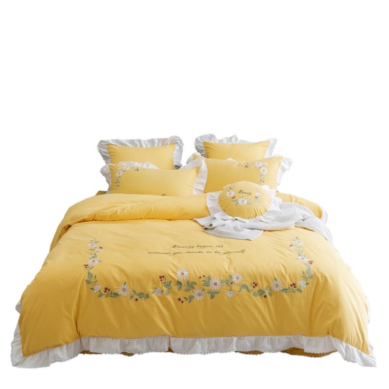被这抹黄色惊艳到了,色泽亮丽饱满,温馨时尚不落俗套,舒适的全棉面料,精致的花卉刺绣点缀,清爽甜美,恰到好处,撞色荷叶边,大写的公主风,女生卧室的颜值担当,让卧室充满活力和青春气息,打造出甜美浪漫的休闲...展开