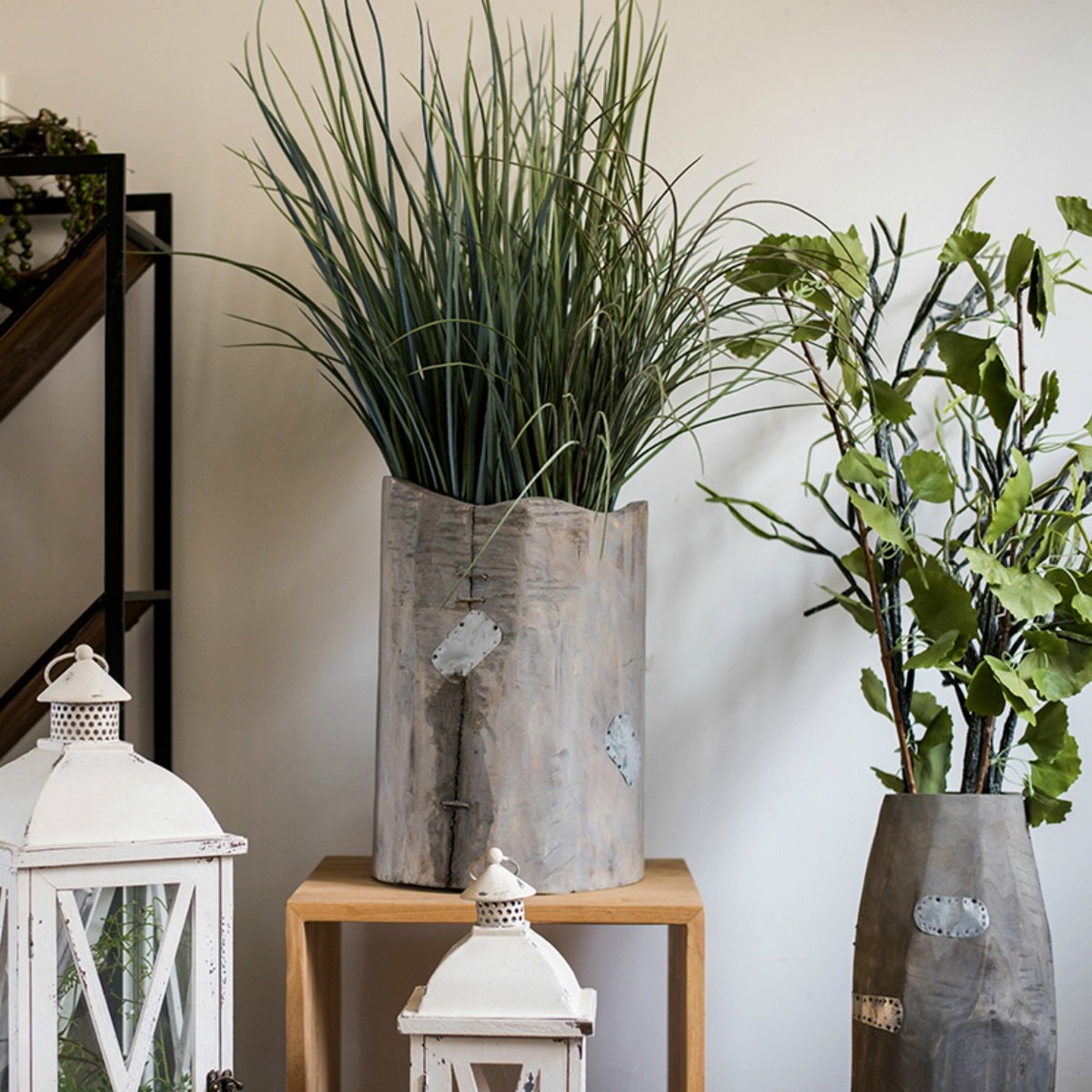 古旧的素木梧桐系列,真正的采用老料新作,表面充满虫洞,巴结,都是自然状态,这样的花器,充满了古旧的故事感,搭配新鲜的草叶,演绎着鲜活与古旧的故事,倒也是一大看点。