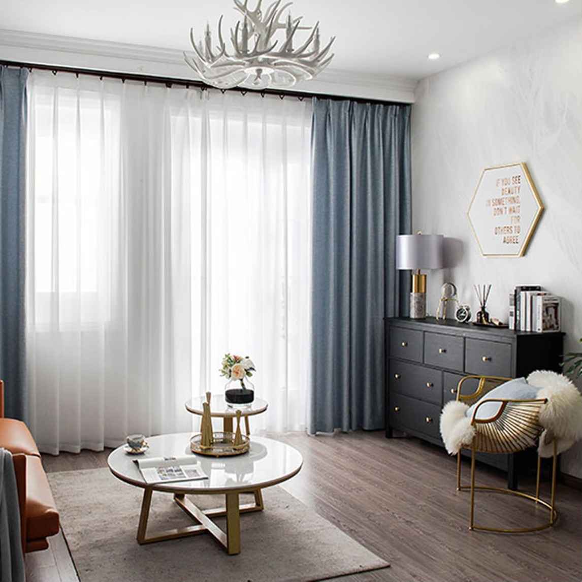 在蓝灰色窗帘的保护下,美丽的欧美混搭风客厅特别吸睛。黑色的斗柜,带着一股贵族的气息,铁艺大理石茶几,小巧精致,明亮有加,温润的深色地板,映着客厅显小资情调。