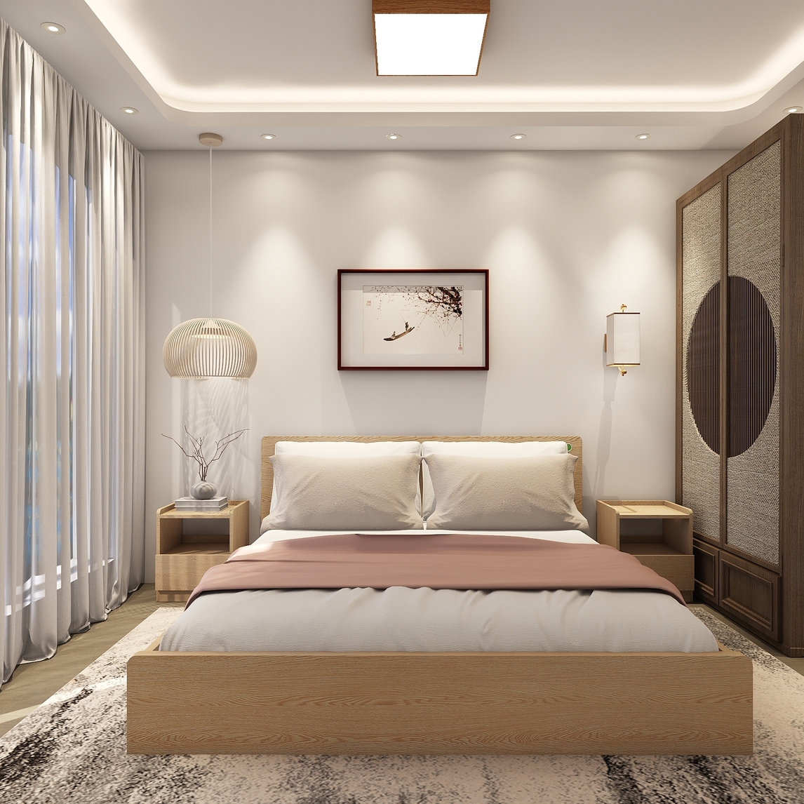 卧室的整体硬装部分遵循极致简约的设计理念,经典大白墙搭配自然色木地板,构筑清新素净的空间基调。家具方面以木制为主,融合新中式风格与日式元素,营造温暖自然的生活氛围。宽敞的双人床大气沉稳,简练的线条勾勒...展开