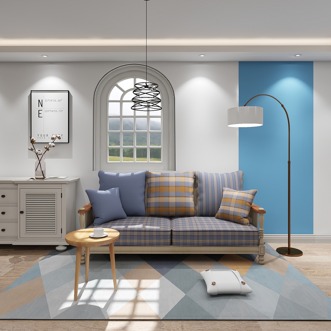 采用地中海风格设计的客厅,选用简单、明亮的色彩搭配,营造清新柔和的空间氛围。木制沙发采用简单的雕花装饰,表面做旧擦色,流露出古老的文明气息,最后搭配格纹面料,展现朴实自然的田园风情。茶几选用极简款式,...展开