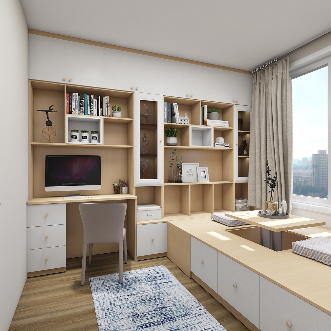 轻松解救小空间,定制榻榻米多功能兼备。一张床的空间就能达到收纳、会客打牌和休息的要求,比床还灵活一百倍,还保证书房的功能完善。中间做地台,旁边放书桌,看书累了可以直接躺下,采光和舒适度max。