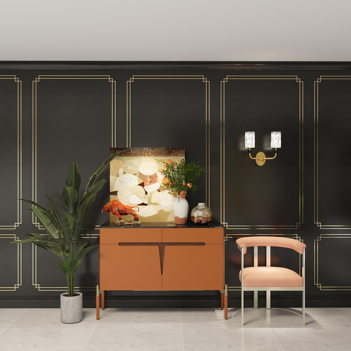 黑色的主体背景散发出一种神秘感,靓丽的橘色柜体在,碰撞出了空间不同的色彩感,搭配气质优雅的椅子,在不同色彩叠影下,混搭变得独一无二