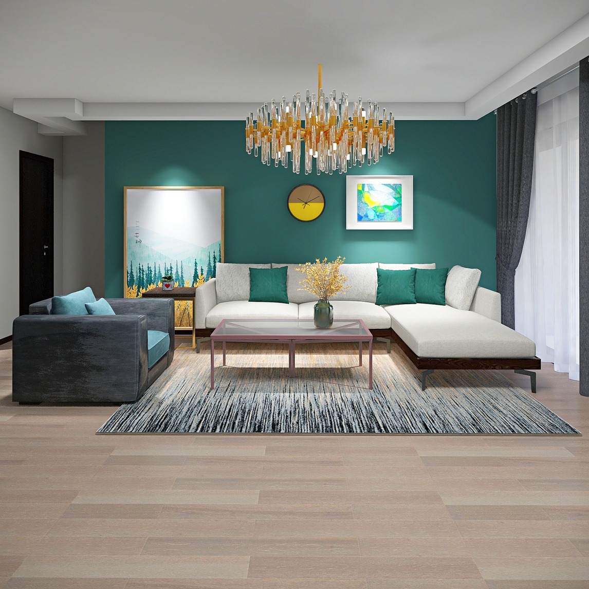 入目大量的高纯度的绿色元素营造自然时尚,再加入高纯度的黄色作为空间提亮点缀,整体时尚大方,而且适当的后现代金属元素加入,给空间更添精气神,整个画面十分带感