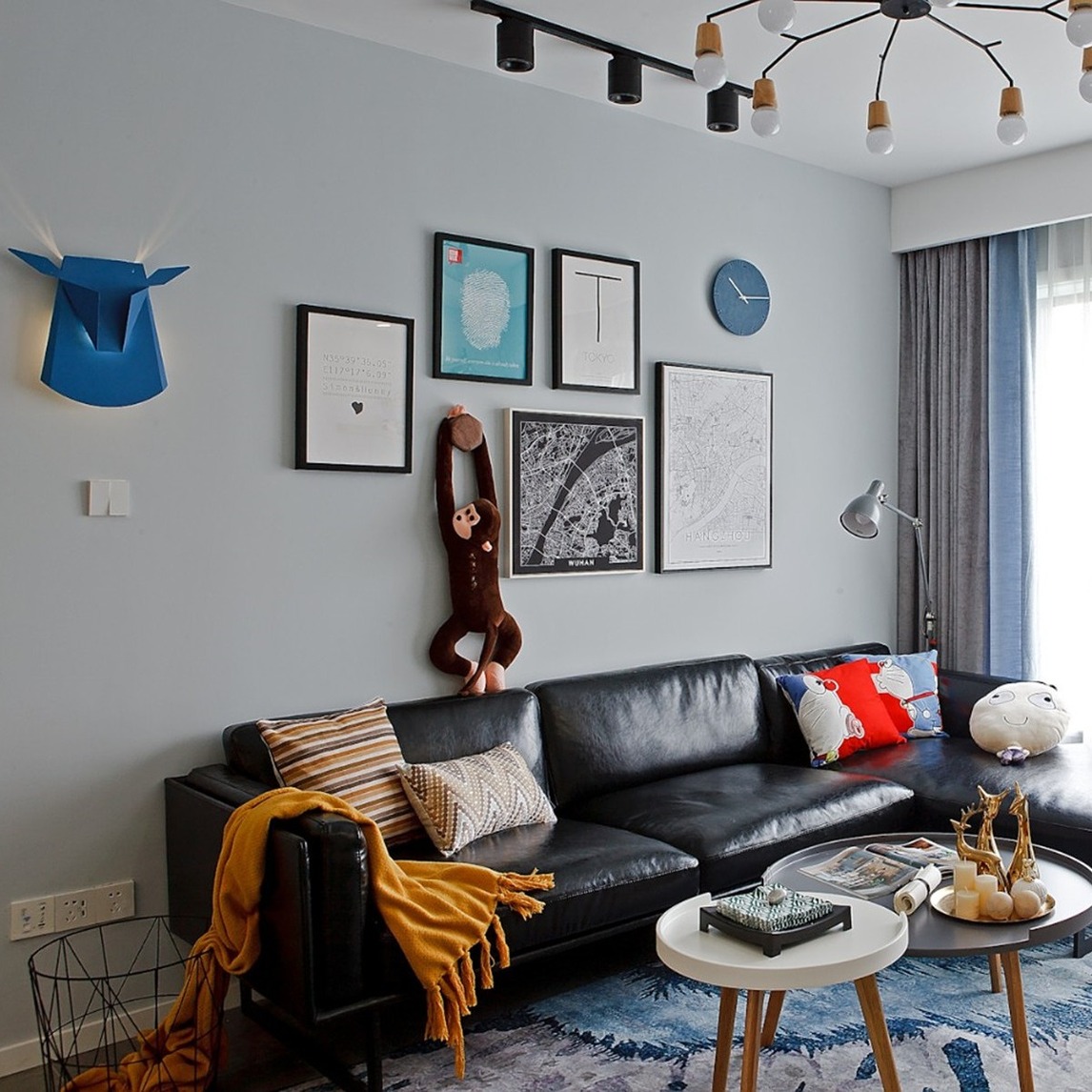 混搭风也不错,美式的沙发搭配北欧的挂画,打造温馨又格调的客厅空间,黑色沙发更显沉稳,清新软装增加空间活力。