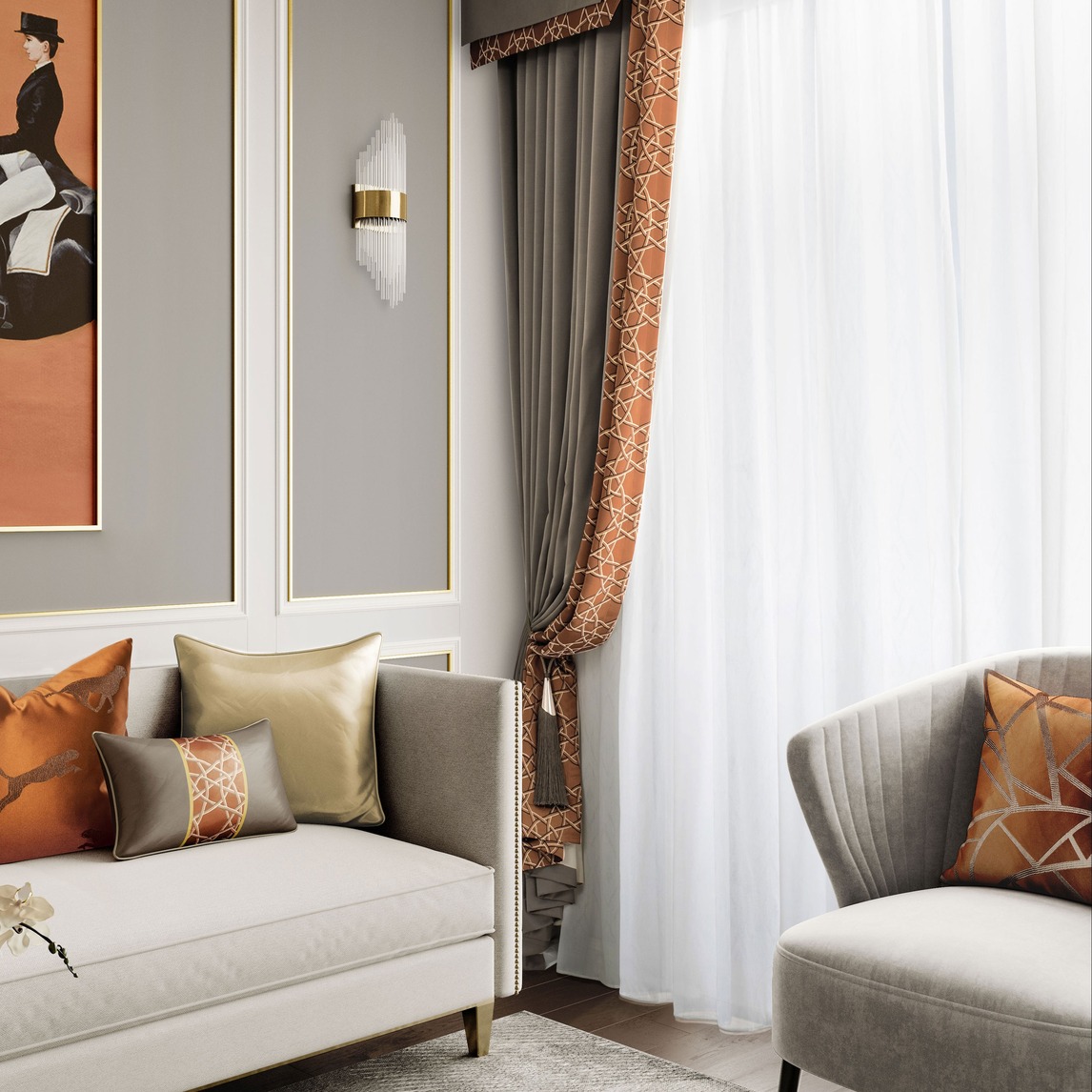 轻奢风空间里面,金属几乎成为了必不可少的元素。在茶棕色和橙色的撞色拼边窗帘基调下,选用了颜色稍浅的沙发,提亮空间;墙面挂了一幅骑士装饰画,利用装饰画和抱枕的色块,丰富空间质感,大理石的茶几和沙发椅子都...展开