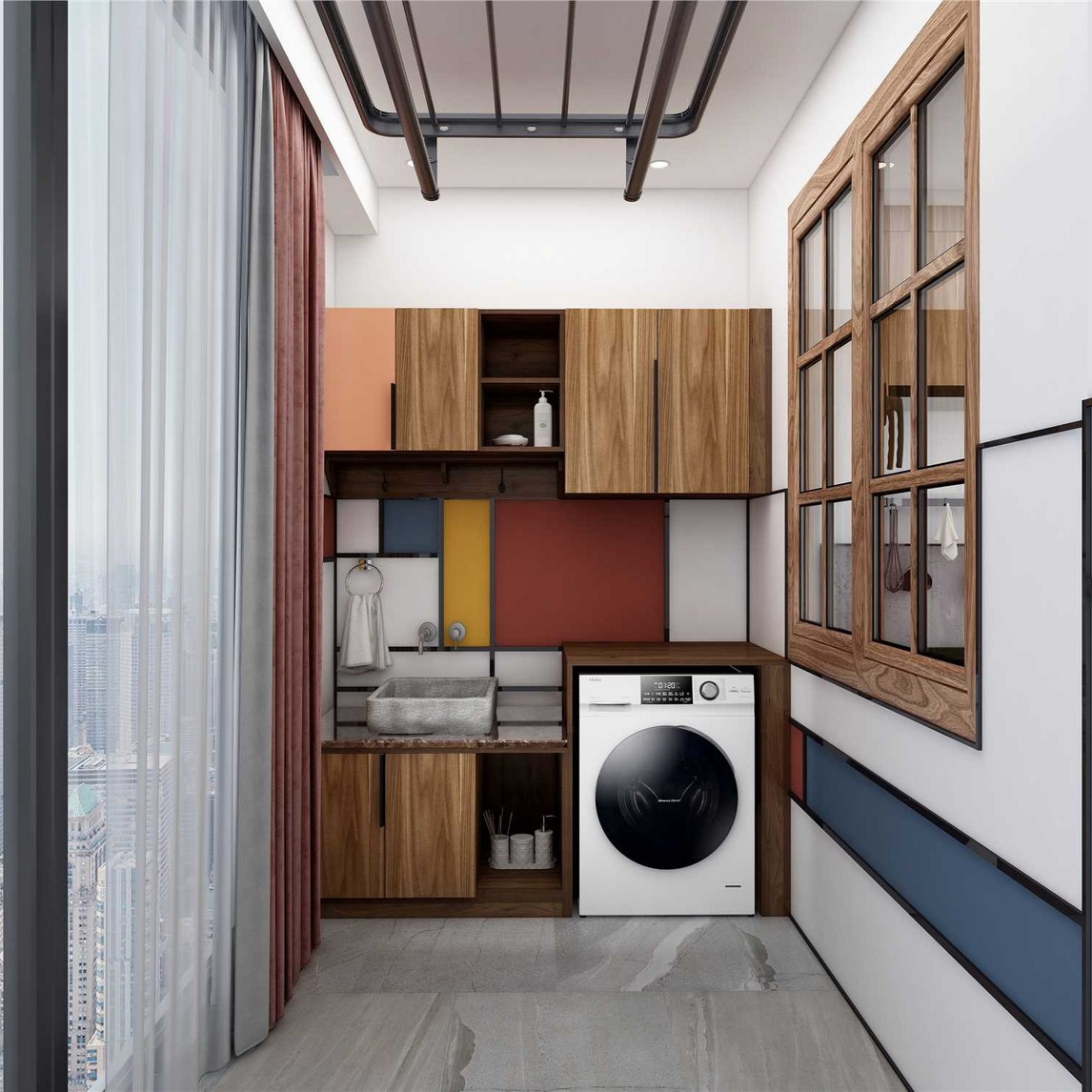小户型对空间的充分利用,没有比它更有说服力了,兼具储物柜、洗漱台和洗衣台,全能之外,更藏有生活美学;木纹柜体下方由看似随心散漫实则精心安排的撞色色块拼接而成,轻、亮的暖色系作为跳跃的彩色隔间,而木纹的...展开